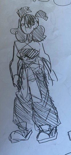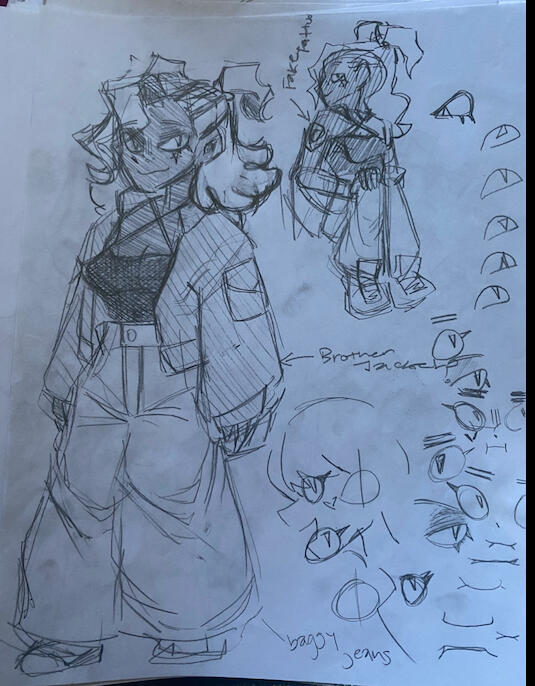I imagined him trying to appear what he believes to be cool with his prescription glasses mimicking sunglasses, a leather jacket, and skinny jeans that he cut panels out of to distress them. Because of his financial background, he wouldn't be able to afford expensive clothing.